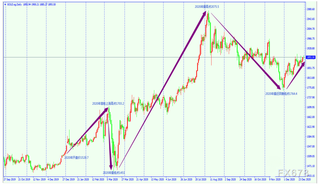 综述:2020年金银价格一致刷新历史高位,创十年最大涨幅。对于2021年行情,随着疫情的持续VS随着疫苗的逐步普及,市场对金银能否续涨存在分歧。但我们预计,整体来看,2021年黄金价格有望继续上行,或将再创历史新高。黄金周图分析详见下文最后。