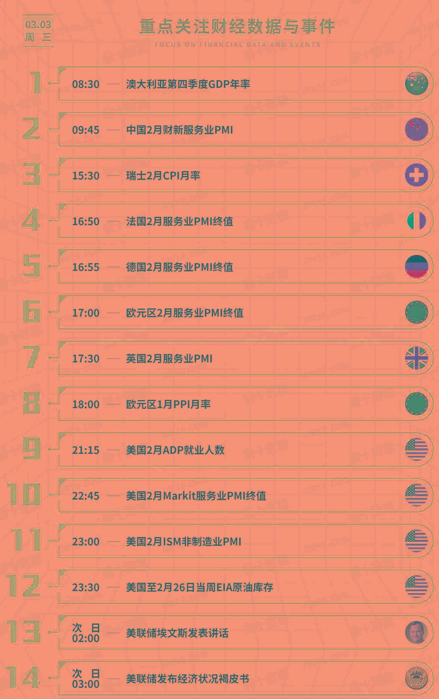 今日需要关注的重要数据较多,经济数据方面,21:15将公布美国2月ADP就业人数,预计增加17.7万,前值为增加17.4万人,这一数据与周五公布的非农有较强关联。