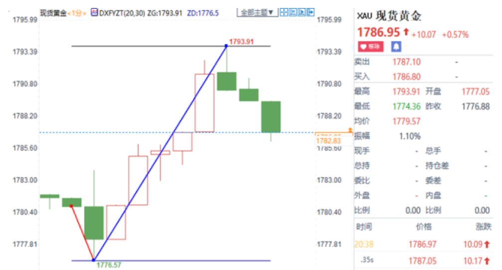 截至发稿,现货黄金跳涨近13美元至1793.91美元/盎司,累计波动幅度逾17美元;美指跳水24点至92.414,累计波动近35点。