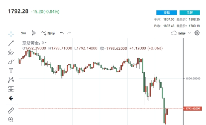 周二美股开盘之后,黄金突然迎来一波短线急跌行情,一度跌破1790,最低触及1789.19美元/盎司,日内最多跌近20美元。