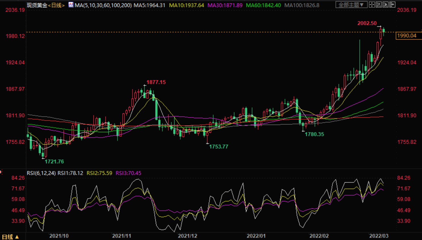 与此同时,金价在本周初的大部分时间里都是围绕美元展开的。美元周一上涨,受避险资金流入提振,这在一定程度上削弱了贵金属的价值。市场正在权衡油价飙升对全球经济增长的影响。欧盟和美国都在考虑禁止从俄罗斯进口原油。全球基准油价布伦特(Brent)因此一度飙升至138桶。