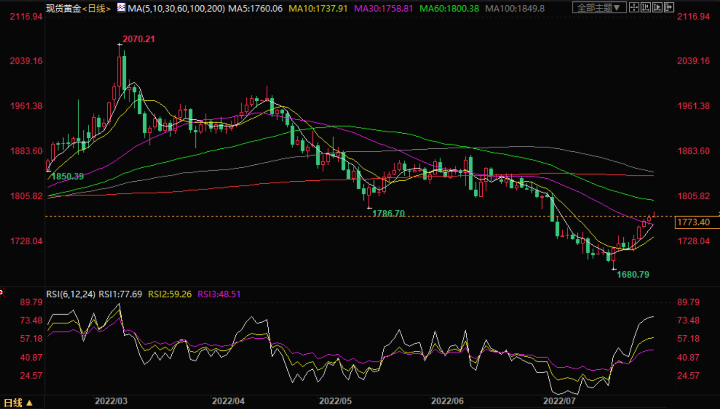 黄金价格每小时上涨的通道形成,支持上行走势的延续。上述图表模式的上半部位于7月22日的高点1739.37美元,而下半部位于7月21日的低点1681.87美元。