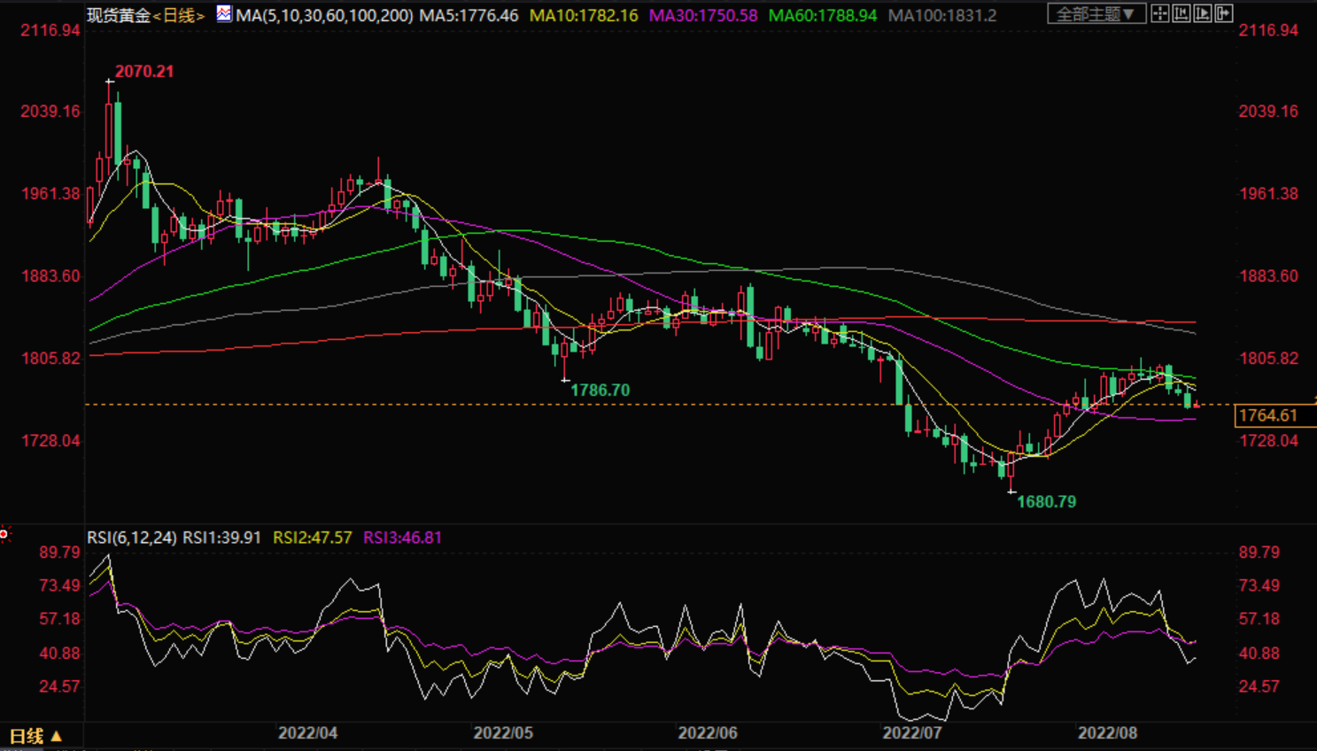 周四亚盘,现货黄金徘徊于1766附近。金价周三跌幅有所收窄,此前美联储会议记录显示,未来加息的步伐将取决未来的经济数据,美元攀升仍令金价承压。最近美联储官员的鹰派发言令不孽息黄金承压。会议记录发布后,联邦基金利率期货交易员预计9月加息50个基点的可能性为57.5%。