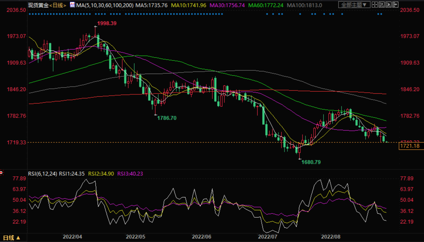全球多数央行的加息前景,尤其是美联储9月份加息75个基点的预期,仍对金价打压明显,周二的数据进一步给该预期提供数据支撑,金价也受到明显的压制,短线金价仍有进一步下跌风险,关注7月27日低点1711.38和1700关口附近支撑;当然,短线仍需留意地缘局势、股市持续下跌、高通胀预期和经济衰退预期给金价提供的逢低买盘支撑情况。