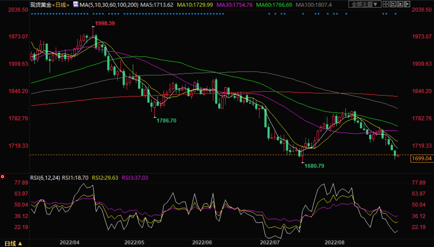 黄金价格在21日创下16800.91美元的月最低值后,正持续下跌。位于1711.61美元的20期指数移动平均线(EMA)正在下降,这增加了下行过滤器。