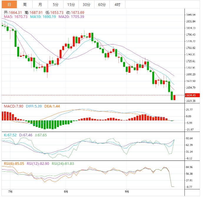 技术上,金价从1621.14美元大幅反弹,此前形成了一个负辐散。当金价触及一个较低的低点,而动量振荡相对强度指数(RSI)(14)做一个较高的低点时,可以观察到下行势头的损失。