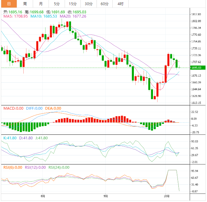 技术上,鉴于金价在颈线和55日均线附近受阻,可能需要形成一个右肩后才能启动中长线涨势,短线留意1700关口和9月21日高点1687.95附近支撑,在跌破1687.95前,后市整体偏向多头,若跌破1687.95支撑,则需要提防金价重回跌势的可能性,进一步支撑参考1680关口,10日均线和21日均线支撑也都在该位置附近,也需要重点关注。
