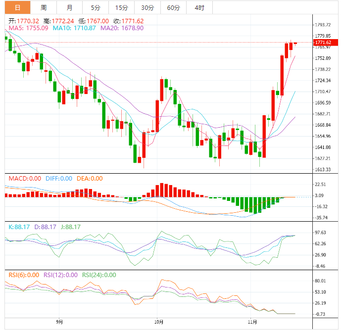 美联储将放缓加息步伐的预期仍在短线支撑金价,金价短线仍有一定的冲高机会,关注8月16日高点1783.02附近阻力和200日均线1803.55附近阻力;当然,由于短线金价涨幅过大,KDJ已经发出超买信号,盘中仍需留意短线多单获利了结等因素引发短线回调走势的可能性,下方关注5日均线1755和9月12日高点1735.02附近支撑。