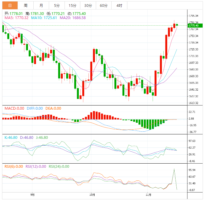 金价正在逐步向11月3日低点1,616.67美元的向上倾斜趋势线下跌。金价在经过修正后,已触碰50期指数移动平均线(EMA),位于1.770.50美元。而位于1,756.00美元的100期均线正在稳步前进,这增加了上行阻力。