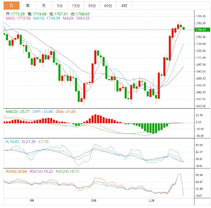 周四早盘,黄金交投于1768.19附近,受美元小幅走强而指标美债收益率下滑影响,市场焦点从全球紧张局势转向美联储的利率策略。隔夜出炉的美国10月零售销售数据强于预期,美联储官员的讲话也略微偏向鹰派,地缘局势担忧有所降温,这令金价小幅承压,周三金价收跌0.3%,K线显示金价短线上涨动能有所减弱,投资者需要提防金价短线的进一步回调风险。
