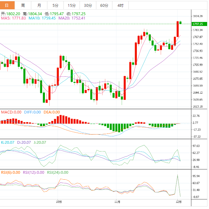 相对强度指数(RSI)线位于14处,超买情况引发金价从多日高位回落。不过,由于MACD移动平均线闪现看涨信号,回调走势仍难以捉摸。
