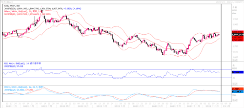 在周三的市场上,隔夜美国10年期国债收益率一度创近一个半月新高至3.862%,这使得前个交易日还大涨的黄金出现获利回吐交易模式的回落,不过整体上还是顽强守住在1800美元之上。由于新年假期前交易活动清淡,且本周没有重要经济数据公布,黄金价格走势受限。在连续四次加息75个基点后,美联储在12月将加息步伐放慢至50个基点。由于美联储加息步伐放缓预期削弱了美元吸引力,金价已从9月底的两年多低点上涨近200美元。然而,美联储主席鲍威尔警告说,美联储明年将进一步加息,欧洲央行在加息紧缩方面的态度坚定,也是抑制了黄金多头的冲动。关键影响元素上,美元表现、通胀数据、美联储加息路径和地缘政治紧张局势将是影响2023年金价的主要因素。而近期美国耐用品需求下降,个人消费支出(PCE)物价指数大幅下滑,增加了美联储提前降息的预期。ING的经济学家一致认为,经济衰退将加速通胀下滑,并将允许美联储在2023年结束前通过降息做出回应。荷兰国际集团经济学家预计:“美联储维持紧缩政策的周期内,金价将保持下行趋势。但美联储在激进加息周期释放放松的任何信号,都将提振金价。要实现这一预期,可能需要通胀出现显着回落的迹象。2023年通胀料将出现大幅回落,这将为美联储在2023年下半年开始降息打开大门。目前对于明年美联储将开始实施宽松政策的预期开始升温,这似乎有利于金价继续展开反弹。就近期来看,1800美元关口的争夺较为激烈,这也是黄金多头和空头都密切关注的水平。