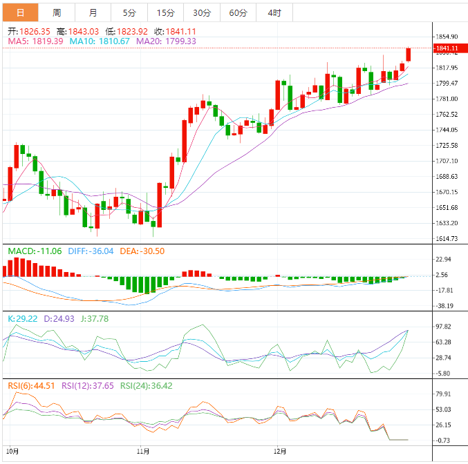 黄金价格正在处在上升三角形图表模式中,水平阻力位位于12月13日的高点1,824.55美元,而向上倾斜的趋势线位于12月16日的低点1,774.36美元。