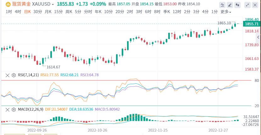 美元指数接近104.409,但回吐了部分涨幅。金价跌破1850美元,延续接近1843美元,然而发稿时,金价徘徊于1855美元附近。美国国债收益率在金价波动中起着重要作用,10年期美债收益率录得3.709%,日内下跌3.5个基点。因此,如果金价维持上涨处在1850美元上方,则有望测试1900美元。