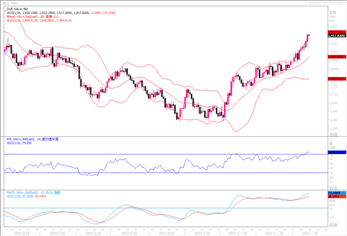 上周五(1月13日),黄金价格继续暴力拉升1.20%,盘中继续创下去年4月份以来的高位1921.86美元/盎司水平。