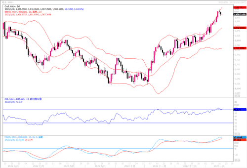 周二(1月17日),现货黄金继续着回调走势,当日下跌0.49%,最后报收于1908.20美元/盎司附近,较日内高点回落约11美元。