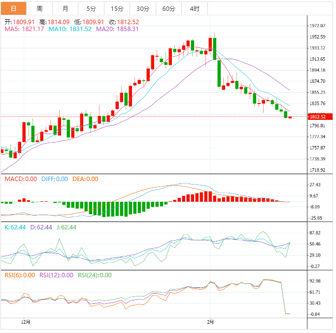 技术面来看,金价短线接近单边下跌行情,收复10日均线1831.52前,后市偏向进一步试探1800整数关口附近支撑,甚至是100日均线1791.04附近支撑,200日均线支撑目前在1775.95附近。