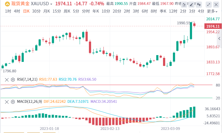 受银行危机的冲击,市场进一步押注美联储在抗击通胀方面不会那么激进,黄金价格周五(3月17日)飙升逾3%,周五当天最高触及1989.16美元/盎司水平,大有冲击2000美元高点的势头。黄金上周全周已飙升了近120美元。