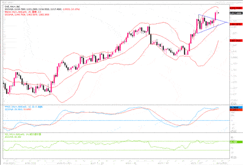 技术图形上,金价强势突破关键的上升趋势线支撑1968美元,并在周二收盘于其上方,确认突破三角旗形形态。黄金多头进攻需要突破2030美元的阻力位才能测试三角旗形的目标位2043美元,之后下一个上涨目标位在2050美元的心理关口;短期支撑位于3月20日高点2010美元,若跌破该价位,2000美元关口将挑战看涨信心。若继续调整,黄金空头可能指向三角旗形上沿1988美元。