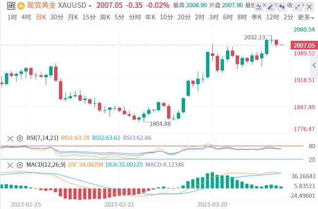 周四(4月6日),现货黄金收报2006.78美元,本周上升38.41美元或1.95%。