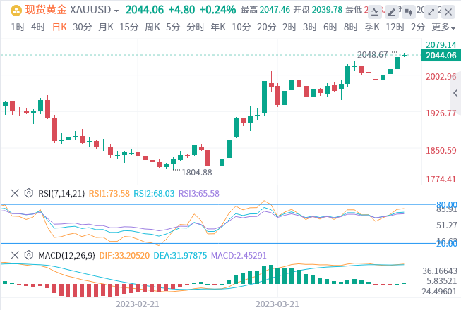 周四(4月13日),美国生产价格指数(PPI)增幅继续低落,提升美联储可能暂停或放缓加息步伐的押注及其对今年温和衰退的预测,现货黄金周四(4月13日)获得进一步提振而突破2040美元/盎司,最高去到2048美元/盎司,距离历史高位仅20来个美元,且为去年3月来最高水平,日内涨幅达1.22%。