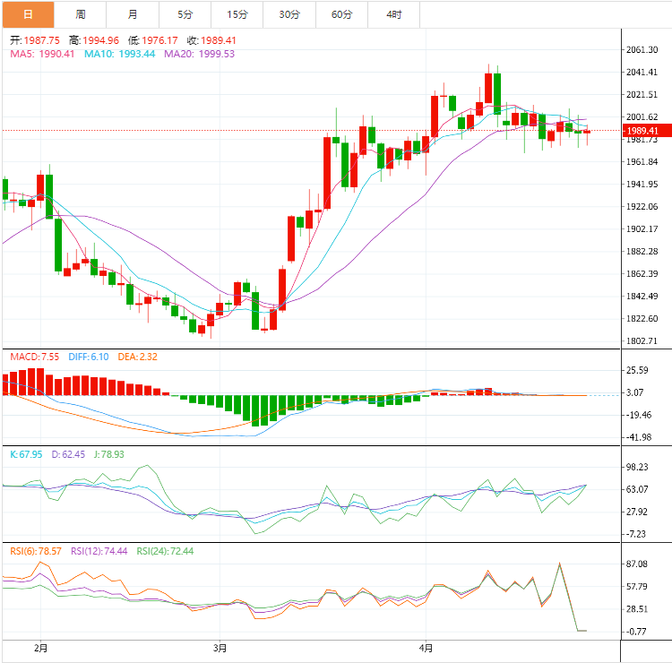 由于缺乏具有重大影响的数据发布,黄金价格进行了技术性调整,本周开盘小幅上涨。然而,在周一华尔街收盘后,美国国债收益率开始走低,第一共和银行的收益报告显示,该银行第一季度存款减少了1000多亿美元。随后,澳元兑美元延续反弹,周二收于2000美元附近。