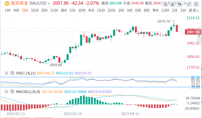 5月5日,周五纽市盘中,黄金面临沉重的抛售压力,延续了前一天从历史高点大幅回撤的跌幅,大约在2,078-2,079美元区域。跌势因美国月度就业数据向好而加快步伐,并在北美早盘时段将黄金/美元拖至3天低点,低於2,010美元水平。