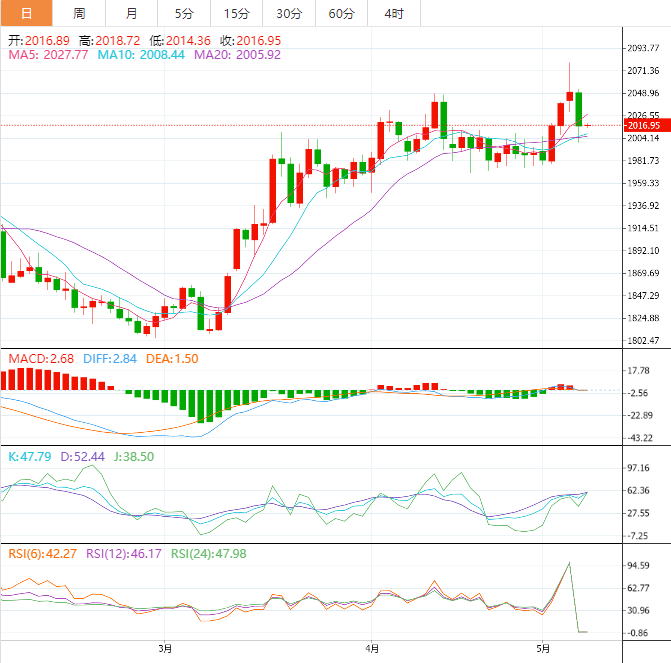 周一亚洲时段,黄金交投于2016.24附近。金价上周五急挫,此前强于预期的美国就业数据打击了对美联储的降息预期。截至收盘,黄金下跌1.61%,至2016.37美元。但上周上涨1.3%。在美联储上周三暗示其加息周期可能结束后,现货金上周四急升至2072.19美元,略低于2072.49美元的纪录高位。