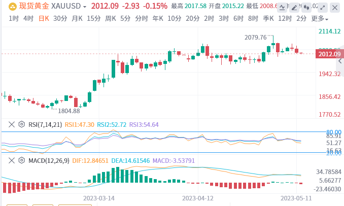 周四(5月11日),由于美元回强,金价延续跌势,当日下跌0.74%,收盘于2014.90美元水平。