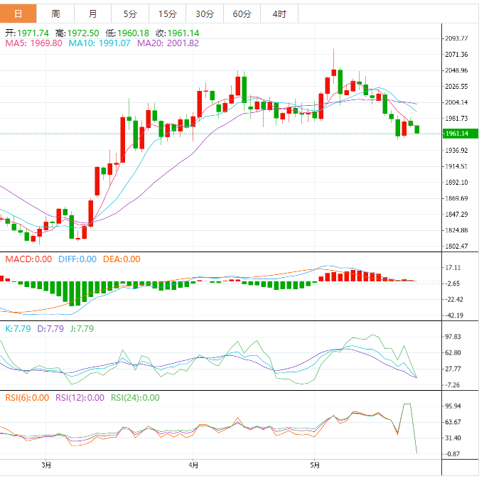 虽然市场仍有一些避险情绪支撑金价,也有一些观望情绪,但是周一多位美联储官员的鹰派讲话后,市场对美联储6月份暂停加息的预期有所降温,加息25个基点的预期再度升温,美元维持强势,美债收益率持续上涨,对金价打压明显,市场对债务违约的担忧情绪也在降温,金价短线偏向空头,可能会再度试探1950关口附近支撑,并可能进一步下探100日均线1931.37附近支撑。