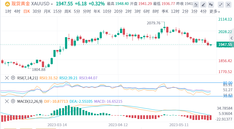 技术层面上,在日线图上,价格跌至九周低点,呈下降趋势,显示空头暂时夺得优势。金价在突破4月初以来的关键支撑线后触及两个月低点,目前的即时阻力位为1956美元附近。移动平均和MACD指标发出明显看跌信号,以及金价持续跌破50移动均线和月阻力线(目前在1975美元附近),都加大了黄金的下行倾向。下方关注的支撑位置依次在1935、1925美元。若跌穿,则金价自2月至5月涨势的61.8%斐波那契回撤位1909美元的支撑显得尤为关键。而3月中旬低点1885美元附近可能成为黄金买家的最后防线。即便黄金能展开短期反弹回补,预料上方暂时也难以穿破1980阻力水平。