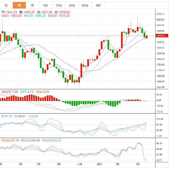 截止5月31日黄金市场,金价从月初开盘价1991.29,到月底截止目前报1957.60。黄金整个5月坐上过山车,金价于5月4日触及最高点2081.82,金价最低点触及5月30日1931.96。
