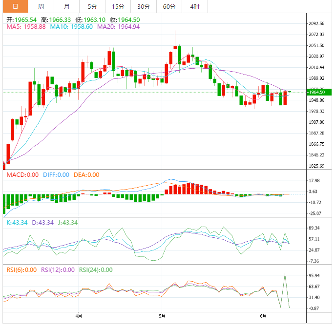 截至发稿时,金价保持在三周前的交易区间内,包括100日移动均线支撑位和自5月18日以来的小幅下行趋势线,分别接近1,940美元和1,985美元。