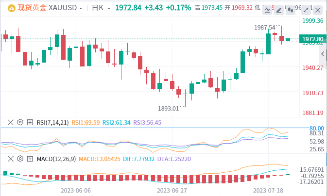 周四(7月20日),由于当日美国公布当周失业申请救济人数意外下降,提升美元利率进一步提高的预期,美元指数反弹,现货黄金先扬后抑,全日下跌0.35%,收盘于1969.12美元水平,上升的脚步略停歇。日内现货黄金最高触及1987.42美元,最低至1965美元。