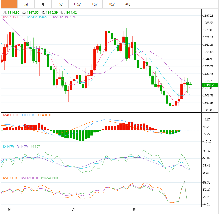 在此之前,在四小时的走势中,布林线中段加入了当天61.8%和一周23.6%的斐波那契水平,限制了金价在1915美元附近的即时下行。