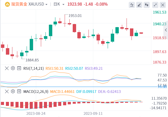 上周五(9月22日),现货黄金价格小幅上涨0.29%,收盘在1924.68美元/盎司水平。上周虽然美联储跳过加息维持联邦基金利率维持在5.25%-5.50%不变。但美联储对于利率前景表达鹰派立场,颇令黄金走势陷入蹒跚的境地。