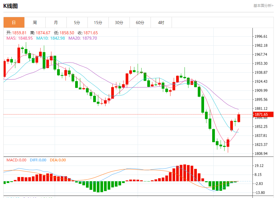 周三盘中,现货黄金报1871.44,涨幅0.60%。