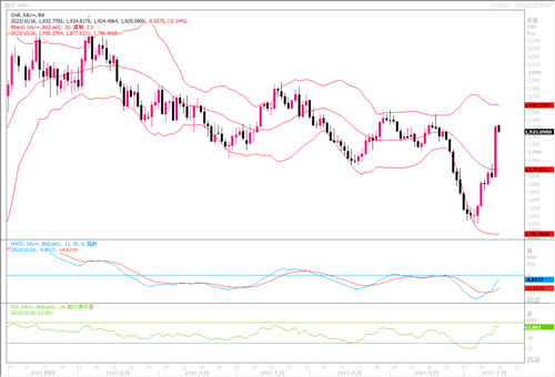 技术层面上,日K之中,目前是第一压力位置1930附近,是趋势线的压制位置;日K随机指标金叉,依旧是主多信号。然而上方的压制位置比较多,分别是1930-1940/45-1965/60-1985/90。所以,要想全部吃掉这些压力位置,暂时难度是比较大。短线4小时图上,大阳线强势拉升,形态上趋势多头控盘为主;随机指标金叉状态,MACD双线向上,主多信号。但大阳线之后,上升空间收缩,上升动能衰减,须留意大阳线之后,短线获利调整的风险,回落的强支撑位置将落在1900-1885区域。