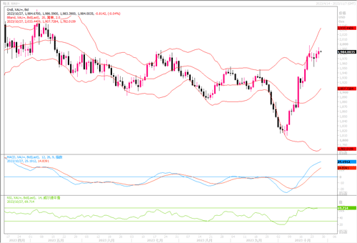 日线图上,黄金均线继续向上发散,金价经一周的小幅震荡整理后,再次向高点进发。目前金价紧贴布林带通道上轨线,各类技术指标继续超正向区域散发,显示多头动能较强。上方将有可能继续闯试2000美元大关,若能突破,进一步目标将瞄向2020、2050水平。目前下方1970给到初步支撑,随之在1950。若上述支撑水平都不保,则增加了回落的风险。