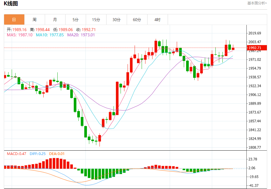 周四盘中,现货黄金报1992.01,涨幅0.12%。