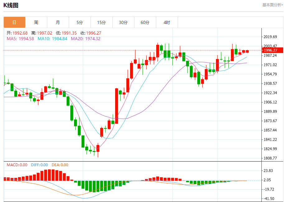 周五盘中,现货黄金报1996.50,涨幅0.20%。