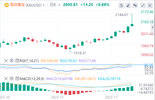 黄金在亚市早盘升至历史新高,且上升趋势看起来势将延续至明年。目前由于市场对美联储已完成加息周期的猜测获得更多动力,金价正处于良好位置,美联储主席鲍威尔打压降息预期的行动也没能见效。金价,上涨导致RSI14进入超买领域,在某些时刻价格涨势暂停或者出现微幅回调都是可能的。但整体来看,由于买盘意愿继续积累,金价本轮涨势将在12月乃至2024年逐渐增强。