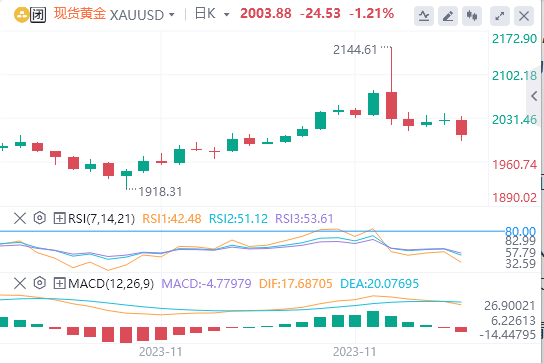 金价周五回落至每盎司2000美元以下,美元和美国公债收益率上涨,就业数据强于预期后交易商削减了对美国3月开始降息的押注。1915 GMT,现货金XAU=下跌1.4%,至每盎司2000.49美元,稍早触及日低1994.49美元。本周迄今,金价下跌3.4%,为10周以来最差周度表现。美国期金GCcv1收低1.6%,结算价报2014.50美元。美国11月就业增长加速,失业率降至3.7%,这表明劳动力市场基本面强劲。