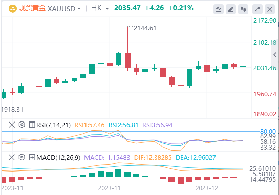 受美元走软和美国国债收益率下降的推动,黄金价格周四小幅走高。这一增长正值交易员热切期待美国经济数据,以深入了解美联储即将做出的货币政策决定之际。美元兑竞争对手下跌0.1%,这使得其他货币的持有者更容易获得黄金。由于即将到来的漫长的圣诞节假期周末,预计成交量将保持清淡。