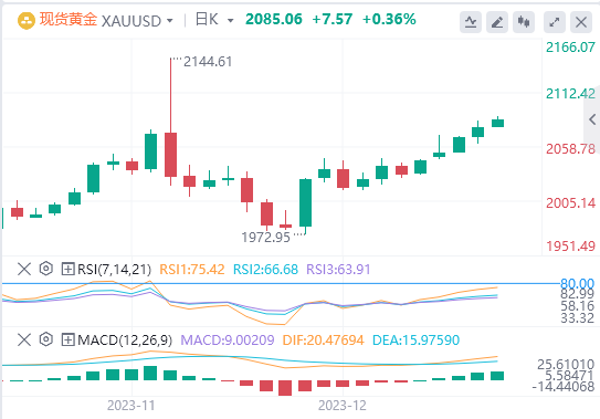 目前金价为2085.06,位于200天和50天移动平均线之上,表明有强劲的上涨趋势。这一位置高于200天移动平均线1960.22和50天平均线2003.69,表明市场存在看涨情绪。