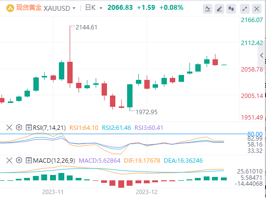 现货黄金先涨后跌,其在亚盘时段突破2080关口,且一度逼近2090大关,但未能站稳此处,并在美盘加速下行且失守2070关口,最终收跌0.65%,报2065.62美元/盎司,截至目前,黄金报价2066.83。