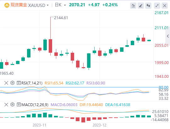进入新年后,金价可能会维持盘整模式,守住高地。周四金价收盘于上升趋势阻力下方,处在2084美元附近,黄金买家可能有些谨慎,但相对强度指标(14)看涨,让多头继续抱有希望。金价需要明确突破该水平,才能突破2,100美元关口,若突破2,100美元,不排除上涨接近历史高位2,144美元,展开新的上涨趋势。