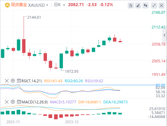 黄金目前的日线价格为2062.71,略低于前一日线收盘价2065.27。就移动平均线而言,该资产目前的交易价格高于1960.62的200天移动平均线和2005.22的50天移动平均值。这表明了一个积极的趋势。