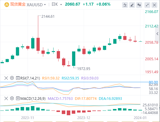 周三亚盘,黄金交投于2060.67附近。周二公布的美国12月标普全球制造业采购经理人指数(PMI)低于投资者预期,降至4个月低水平47.9,而11月以来预期值为48.2。市场偏好因经济数据不及预期而受到影响,投资者开始降低对美联储降息的预期,市场预期中值为年底前降息约150个基点。这与美联储自己的利率预期点阵图形成鲜明对比,美联储目前认为到2024年最多降息75个基点。