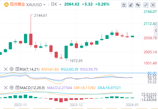 黄金目前的盘整阶段,以2023年的涨幅为基础,表明可能有进一步增长的空间,特别是如果美联储在2024年保持鸽派立场的话。分析师Tim Waterer预计,根据即将到来的经济指标,金价近期可能达到每盎司2100美元。
